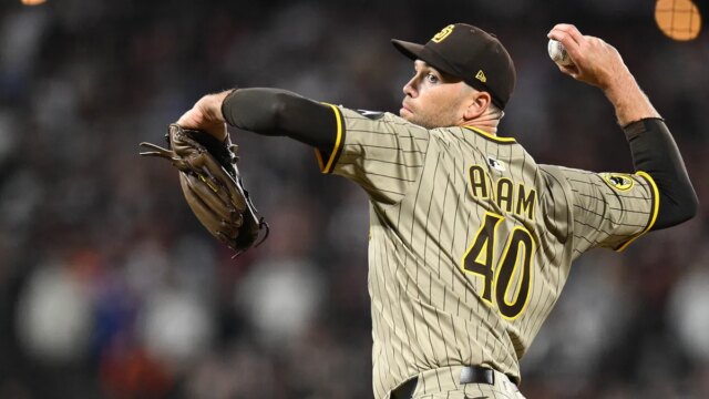 O arremessador do San Diego Padres, Jason Adam (40), lança contra o San Francisco Giants na sétima entrada no Oracle Park. (Imagens de Eakin Howard-Imagn)