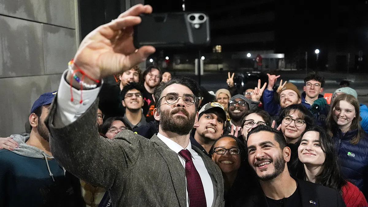 O streamer Hasan Piker, à esquerda, e Abdul El-Sayed, um candidato progressista nas primárias democratas para o Senado dos EUA em Michigan, centro-direita, tiram uma selfie com jovens fãs após um evento de campanha, terça-feira, 7 de abril de 2026, na Universidade de Michigan em Ann Arbor, Michigan. (Julia Demaree Nikhinson/Foto AP)