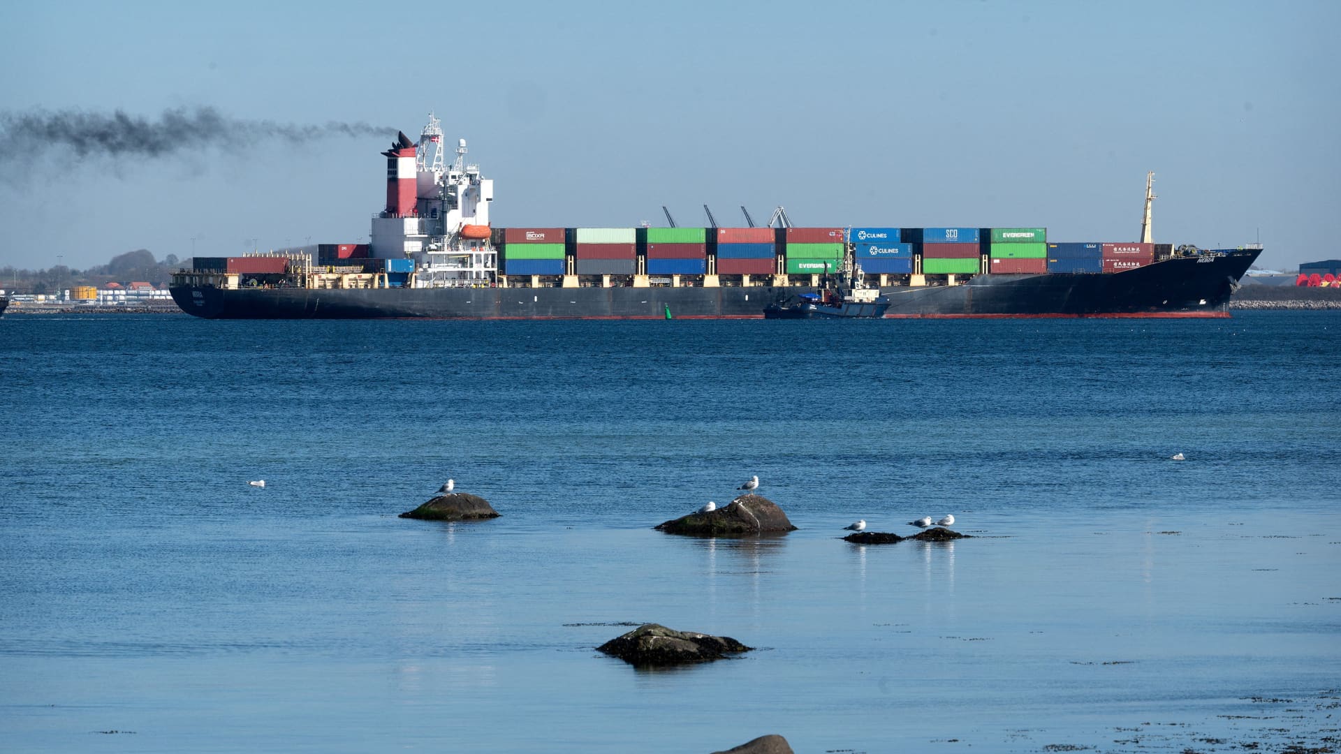 O navio porta-contêineres “Nora”, de bandeira iraniana, no porto de Kalundborg, Dinamarca, em 18 de março de 2026. O navio foi detido pela autoridade marítima da Dinamarca em fevereiro por questões de registro.
