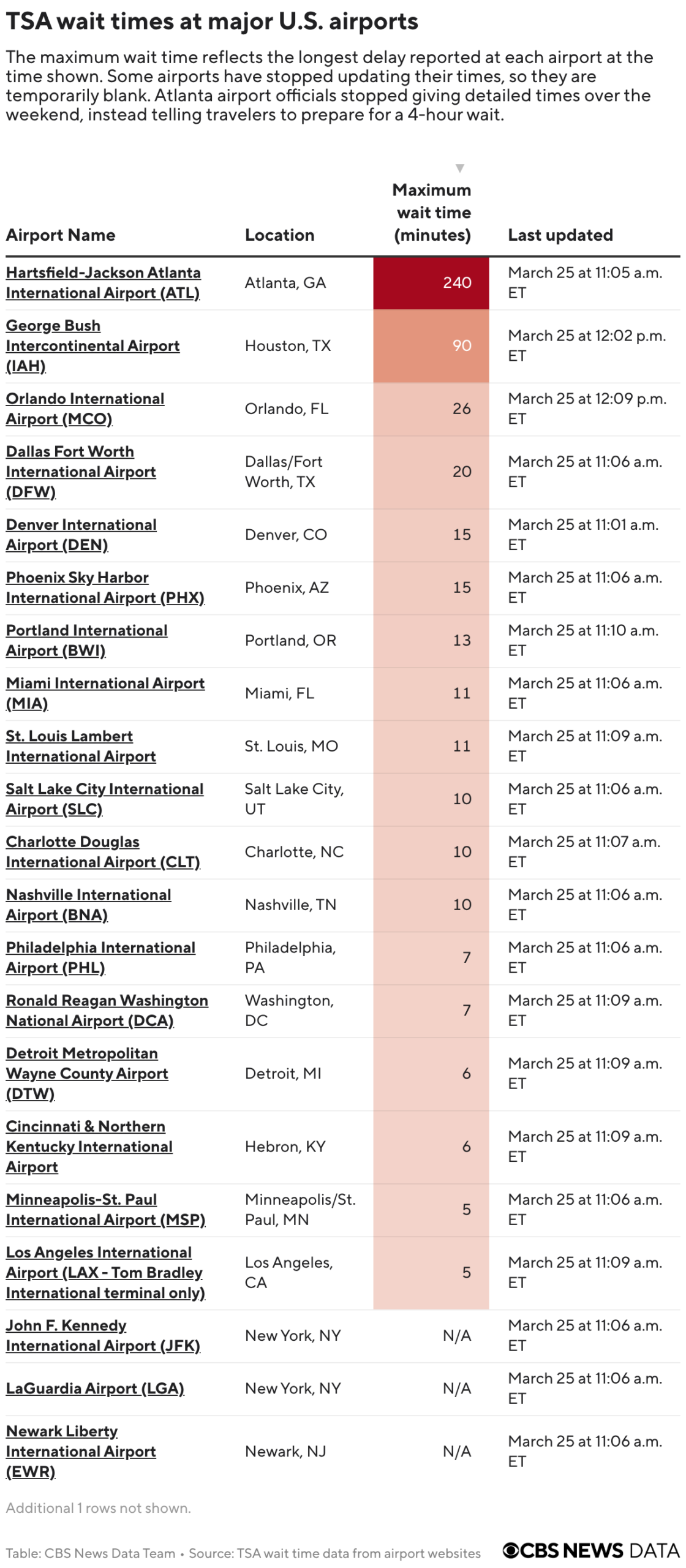 No meio do deadlock, a administração Trump ICE implantado oficiais e outros agentes da Segurança Interna a 14 aeroportos do país para ajudar a transportar passageiros através de postos de controle superlotados da TSA. Na noite de quarta-feira, o gabinete do prefeito de Houston confirmou à CBS Information que a TSA enviará pelo menos 24 oficiais de seu Escritório Nacional de Desdobramento para o IAH na quinta-feira. Os oficiais da TSA da força de destacamento nacional fornecem apoio de triagem flexível e de alto nível em todo o país para aeroportos com tráfego intenso, escassez de pessoal ou eventos especiais.