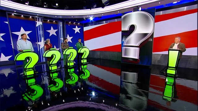 A colaboradora da Fox Information Kat Timpf e o comediante Jamie Lissow inspecionam itens trazidos por um concorrente. (Nação Raposa)