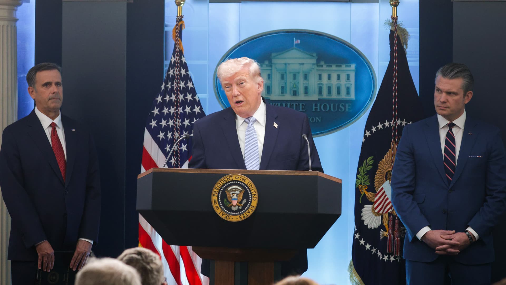 WASHINGTON, DC – 06 DE ABRIL: O presidente dos EUA, Donald Trump, fala ao lado do diretor da Agência Central de Inteligência, John Ratcliffe (L) e do secretário de Guerra dos EUA, Pete Hegseth (R), durante uma entrevista coletiva na Sala de Briefing de Imprensa James S. Brady da Casa Branca em 6 de abril de 2026 em Washington, DC.