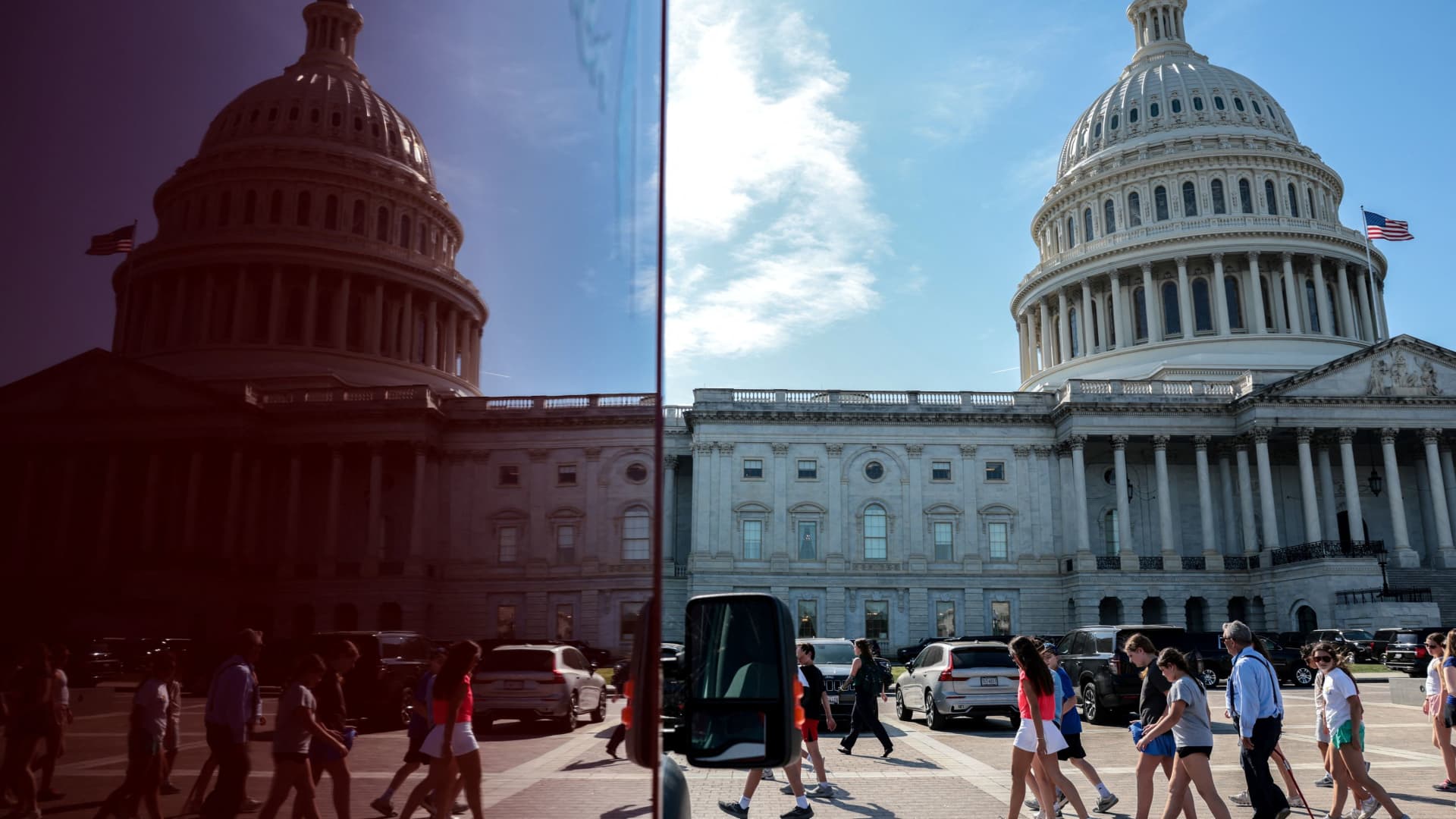 Turistas passam pelo Capitólio dos EUA e são refletidos na janela de uma ambulância estacionada no Capitólio, em Washington, DC, EUA, em 14 de abril de 2026.