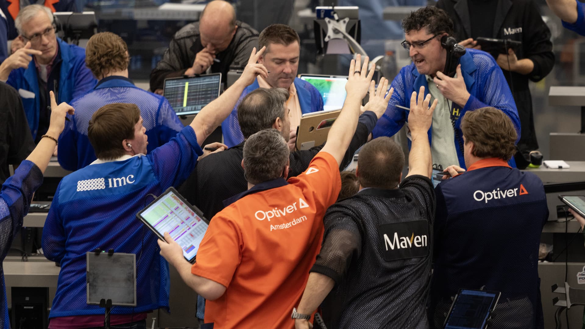 Os merchants sinalizam ofertas no espaço de negociação de opções S&P na bolsa Cboe International Markets em 31 de março de 2026 em Chicago, Illinois.