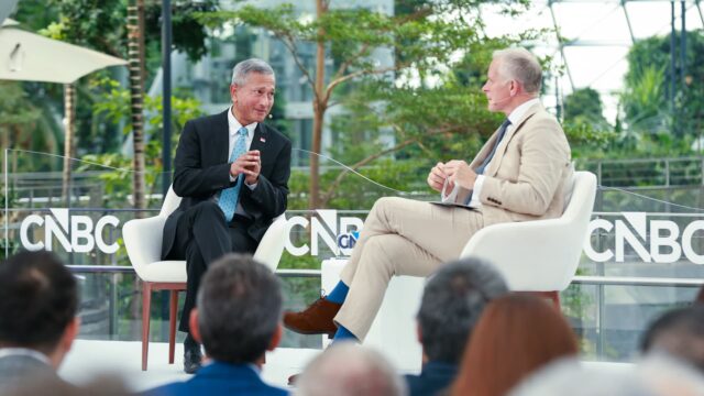 A ministra das Relações Exteriores de Cingapura, Vivian Balakrishnan (à esquerda), fala com Steve Sedgwick da CNBC no evento CONVERGE LIVE em 22 de abril de 2026.