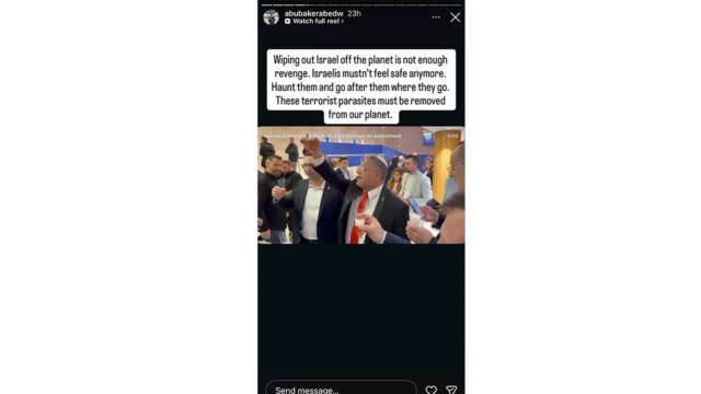 “Exterminar Israel do planeta não é vingança suficiente. Os israelenses não devem mais se sentir seguros. Assombrá-los e ir atrás deles aonde quer que vão. Esses parasitas terroristas devem ser removidos do nosso planeta”, postou Abed no Instagram.