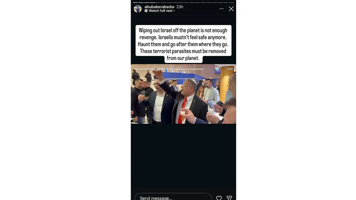 O colaborador do Drop Website, Abubaker Abed, disse a seus seguidores no Instagram que os israelenses são “parasitas terroristas” que “devem ser removidos de nosso planeta”. (Captura de tela/Instagram)