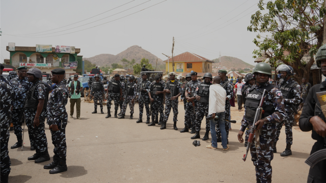 Policiais se reúnem no native do ataque de homens armados na noite de domingo na comunidade Gari Ya Waye, em Jos, norte da Nigéria, segunda-feira, 30 de março de 2026. (Foto AP/Samson Omale)
