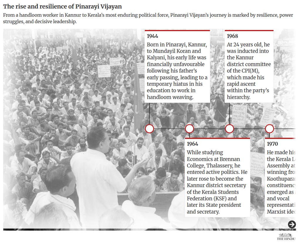 1968: Aos 24 anos, foi empossado no comitê distrital de Kannur do CPI(M), o que fez sua rápida ascensão na hierarquia do partido.