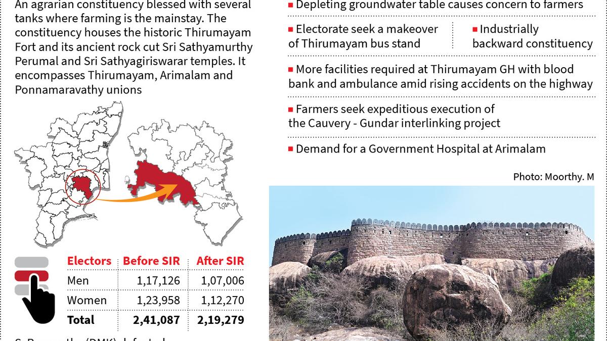 Abrangendo os sindicatos de Thirumayam, Arimalam e Ponnamaravathy, o eleitorado continua a permanecer industrialmente atrasado, necessitando que muitos jovens instruídos saiam em busca de emprego. Os agricultores lamentam que Thirumayam, sendo uma região de sequeiro e abençoada com vários tanques, não tenha sido dada atenção suficiente à gestão da água e às medidas de conservação ao longo dos anos que afectaram os agricultores.