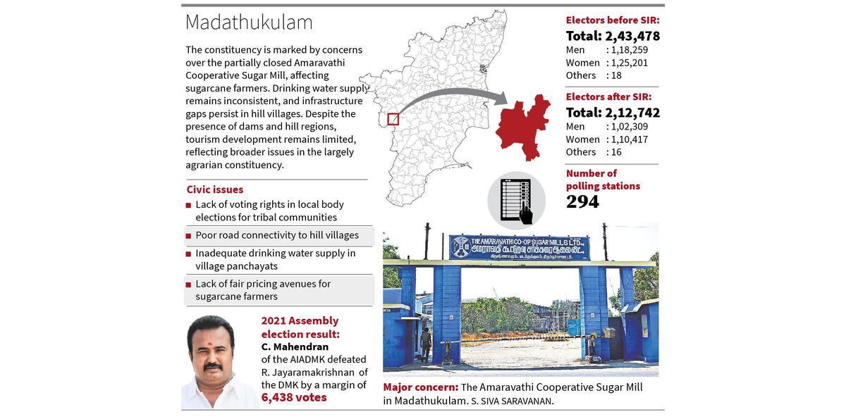 O funcionamento da Usina Cooperativa de Açúcar Amaravathi emergiu como uma questão basic no círculo eleitoral da Assembleia de Madathukulam, com os agricultores a procurarem a sua revitalização para apoiar o cultivo da cana-de-açúcar e garantir retornos estáveis, mesmo que persistam preocupações com o abastecimento de água potável e a falta de desenvolvimento do turismo.