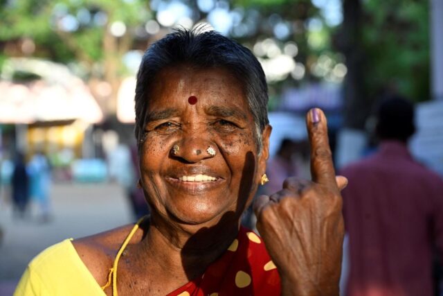 Pasupathy, uma eleitora de 72 anos, depois de votar na escola no distrito eleitoral da Assembleia Sul de Coimbatore na quinta-feira.
