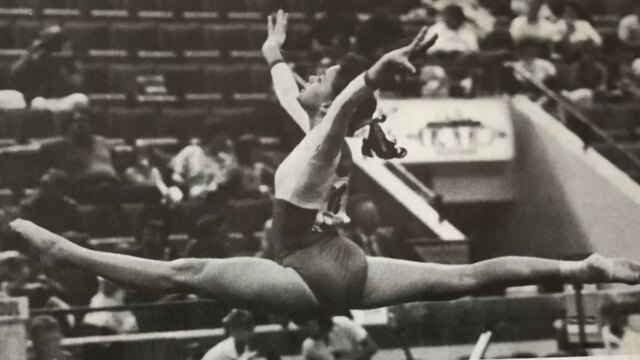 Jennifer Sey, campeã nacional de ginástica geral dos EUA em 1986, dá um salto dividido durante a competição. (Atletismo XX-XY/Jennifer Sey)