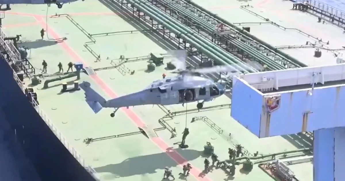 O vídeo partilhado pelos militares parecia mostrar a interdição, com as forças dos EUA a descer de um helicóptero e a subir a bordo de um enorme petroleiro.