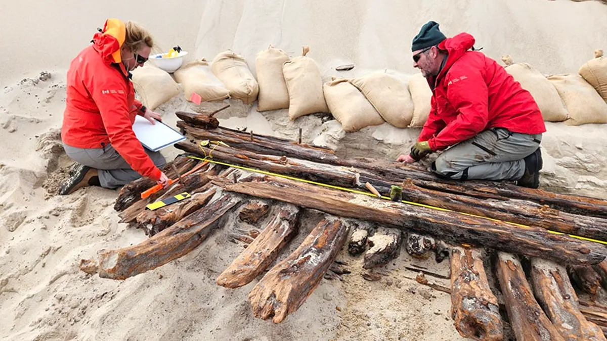 O native do naufrágio foi inicialmente avistado quando apenas pequenos pedaços de madeira eram visíveis acima da areia, segundo autoridades. (Parques Canadá)