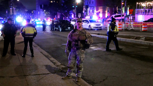 A polícia e a Guarda Nacional ficam em frente ao Washington Hilton depois que o jantar da Associação de Correspondentes da Casa Branca foi adiado para 25 de abril de 2026, em Washington, DC. (Chip Somodevilla/Getty Pictures)