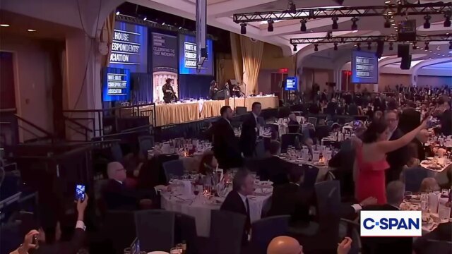 O agente Michael Glantz permaneceu sentado e até continuou comendo sua salada enquanto o presidente e membros do gabinete eram evacuados após disparos no Jantar dos Correspondentes da Casa Branca. (CSPAN)