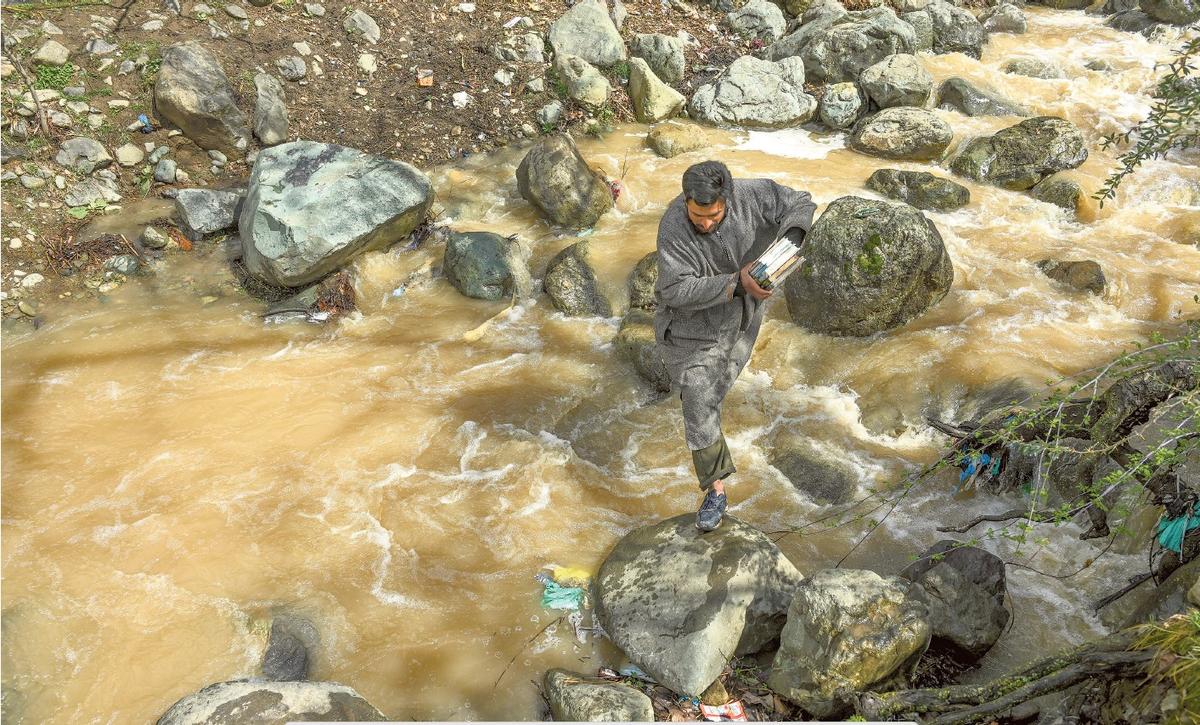 Em mãos firmes: um homem carrega livros através de um riacho, mostrando a crescente cultura de leitura da aldeia em todos os cantos e recantos.