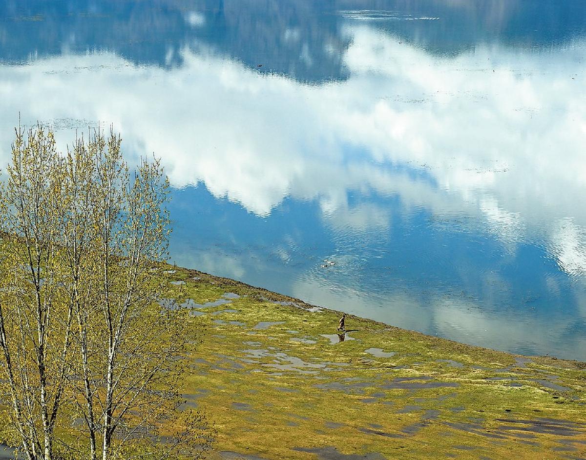 À beira do lago: Um homem caminha às margens do Lago Wular, perto de Aragam. As colinas tranquilas e a paisagem atraem o turista amante da paz ao native.