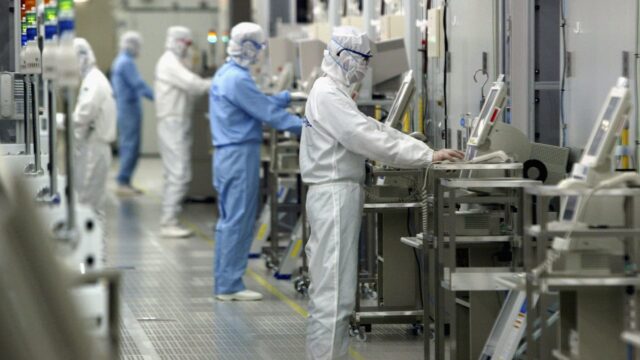 IBARAKI, JAPÃO – 17 DE JUNHO: Técnicos trabalhando na sala limpa do Fab Tools em uma empresa de semicondutores, Renesas Expertise Corp. em 17 de junho de 2004 em Ibaraki, Japão. A Renesas é a primeira empresa a produzir produtos semicondutores a partir de wafer de 300 mm no mundo. (Foto de Koichi Kamoshida/Getty Photos)