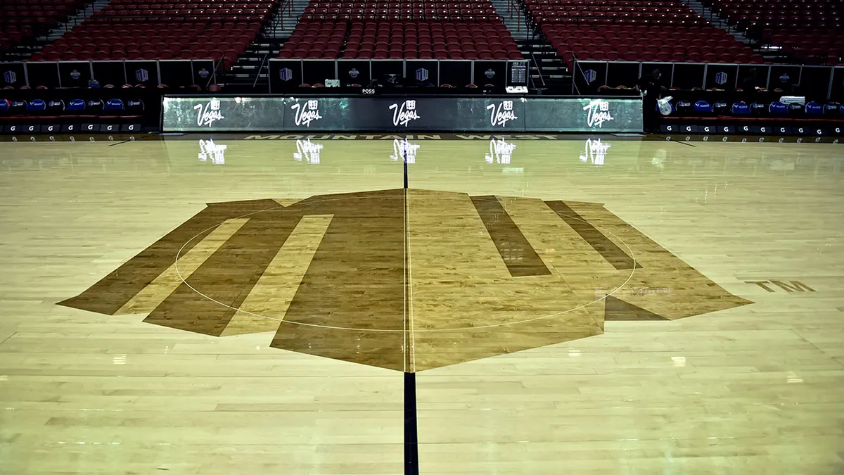 O logotipo da Mountain West Convention é visto antes do jogo do campeonato do torneio de basquete da Mountain West Convention entre os Utah State Aggies e os San Diego State Aztecs no Thomas & Mack Middle em 16 de março de 2019 em Las Vegas, Nevada. (David Becker/Imagens Getty)
