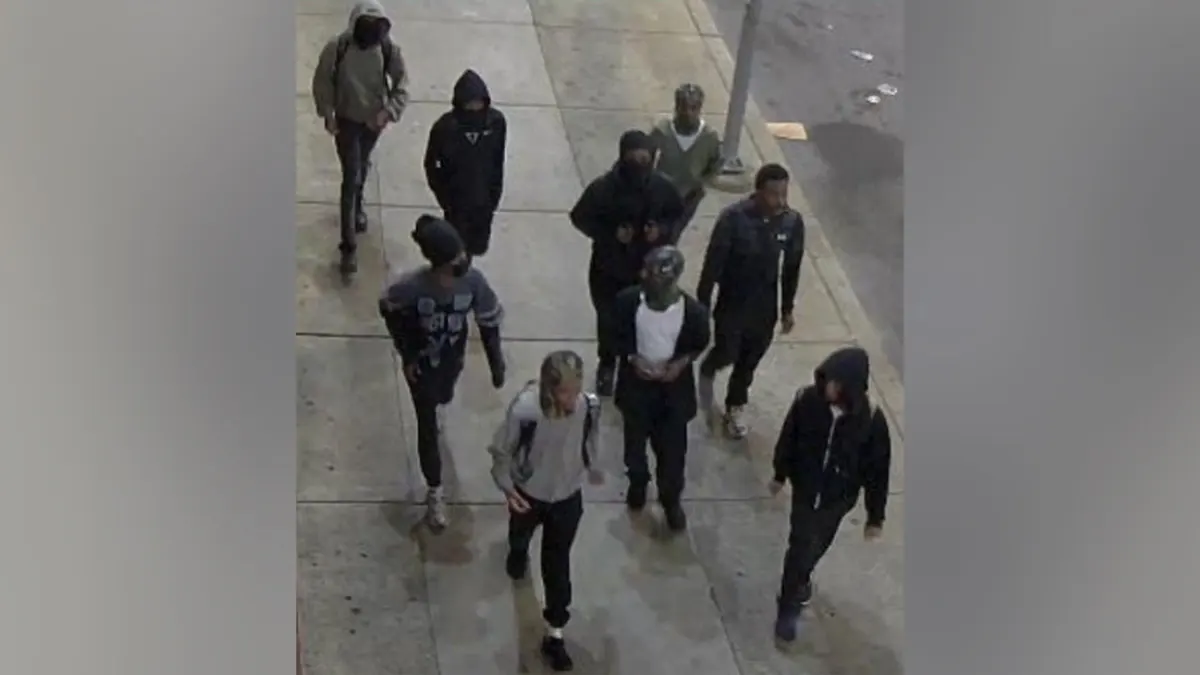 As imagens de vigilância mostram um grupo de nove indivíduos – alguns usando moletons e coberturas faciais – andando em uma calçada, com os rostos de alguns suspeitos visíveis para a câmera.