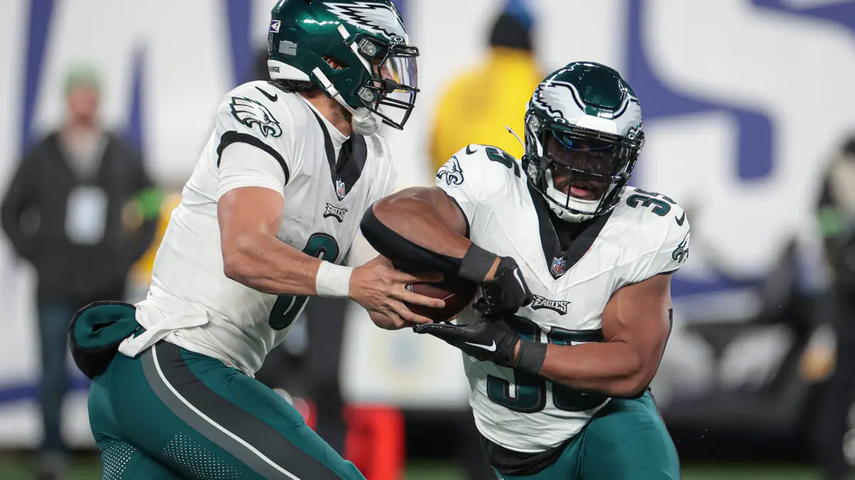 O operating again Boston Scott (35) do Philadelphia Eagles e o security Xavier McKinney (29) do New York Giants em ação durante o primeiro quarto no Lincoln Monetary Area em 25 de dezembro de 2023, na Filadélfia, Pensilvânia. (Invoice Streicher/USA In the present day Sports activities)
