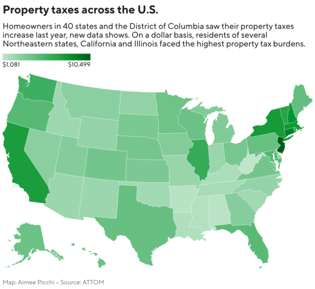 Os impostos sobre a propriedade aumentaram no ano passado, mesmo com o valor médio estimado para residências unifamiliares caindo 1,7%, para US$ 494.231 – ainda entre os mais altos já registrados, mas representando uma ligeira queda ano após ano. Isto mostra que os impostos sobre a propriedade são influenciados por outros factores que não as avaliações de propriedade, com alguns governos locais a aumentarem os impostos devido ao aumento do custo da prestação de serviços públicos, de acordo com ao Centro de Política Tributária.