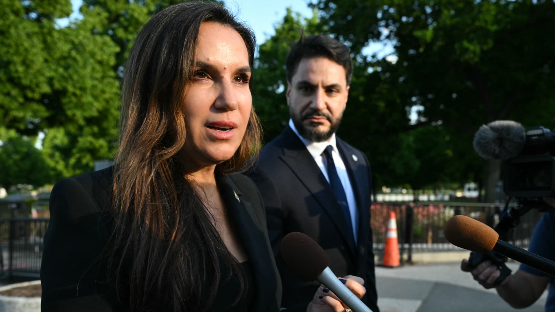 A Embaixadora do Líbano nos EUA, Nada Hamadeh Moawad, fala aos repórteres após uma reunião com o Presidente dos EUA, Donald Trump, o Embaixador do Líbano nos EUA e o Embaixador de Israel nos EUA, na Casa Branca em Washington, DC, em 23 de abril de 2026.