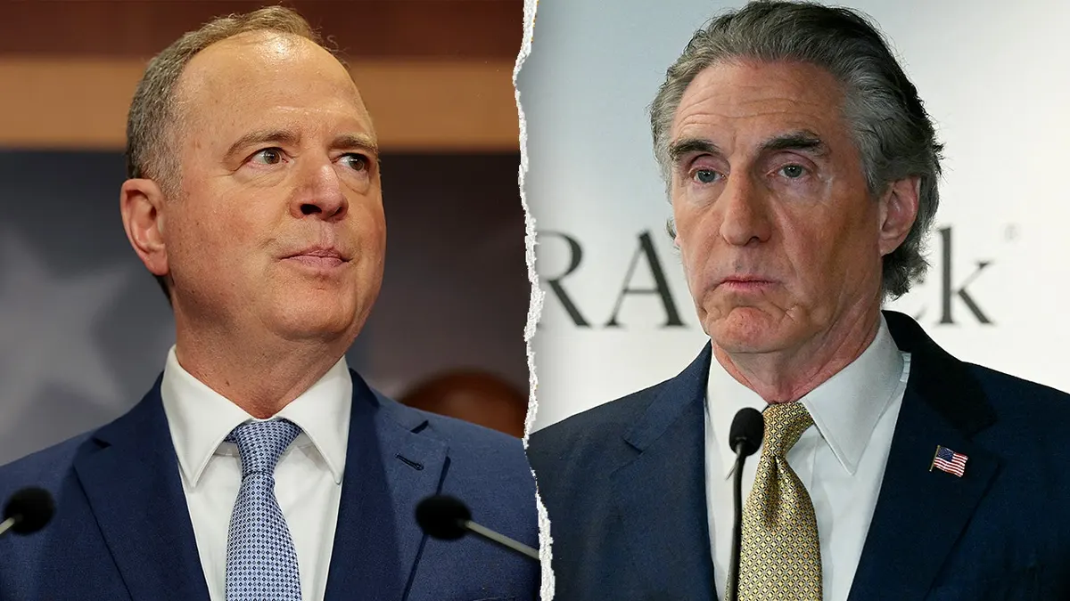 O senador Adam Schiff enfrenta o secretário do Inside Doug Burgum nesta imagem composta. (Anna Moneymaker/Getty Pictures; Ronaldo Schemidt/AFP through Getty Pictures)
