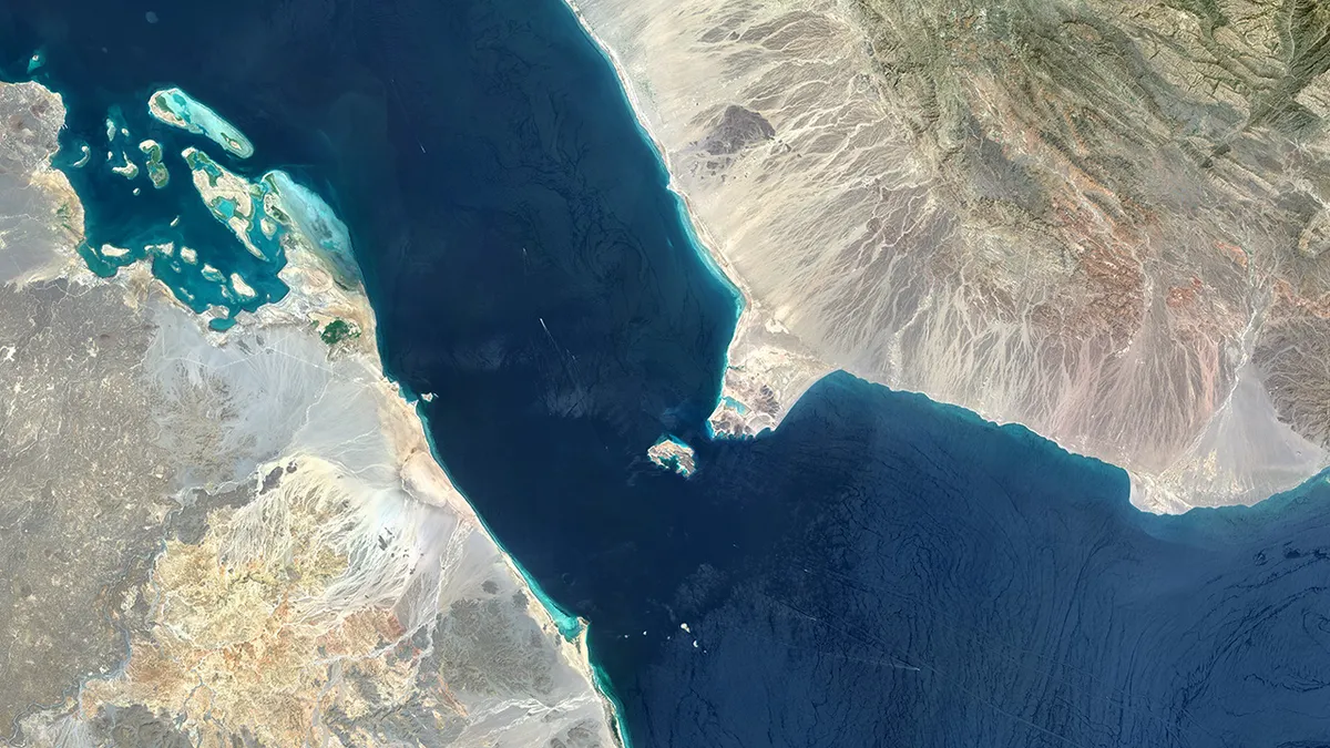 Vista aérea do Estreito de Bab al-Mandeb mostrando a hidrovia e os terrenos circundantes. (Horizonte Orbital/Imagens Gallo)