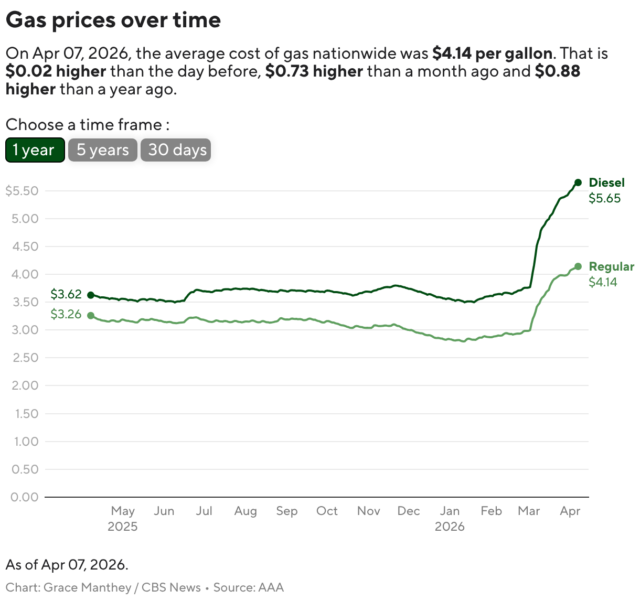 O aumento dos custos do petróleo elevou os preços da gasolina nos EUA ao seu nível mais alto desde 2022. O preço médio nacional de um galão de gasolina regular subiu na terça-feira para US$ 4,14, acima dos US$ 2,98 pouco antes do início das hostilidades, de acordo com dados da AAA.