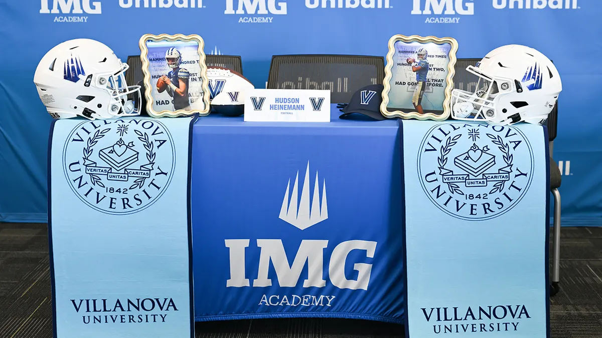 Hudson Heinemann participa do Nationwide Signing Day na IMG Academy em Bradenton, Flórida, em 5 de fevereiro de 2025, comprometendo-se como quarterback da Divisão 1 da Villanova College. (Jason Koerner/Getty Photos)