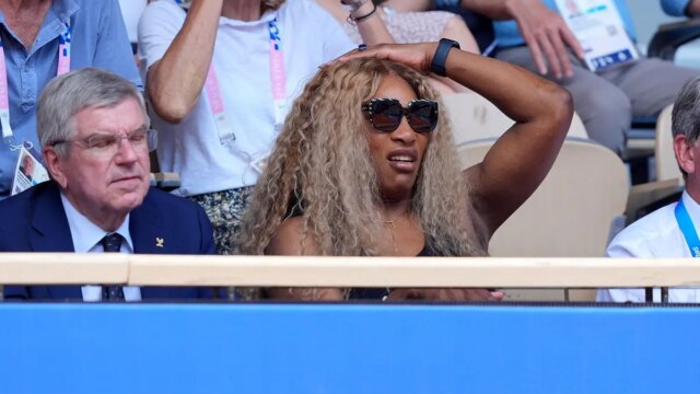 Serena Williams assiste à disputa pela medalha de ouro particular person masculina com o presidente do COI, Thomas Bach, durante os Jogos Olímpicos de Verão de Paris 2024, no Stade Roland Garros, em 4 de agosto de 2024. (Amber Searls/USA TODAY Sports activities)