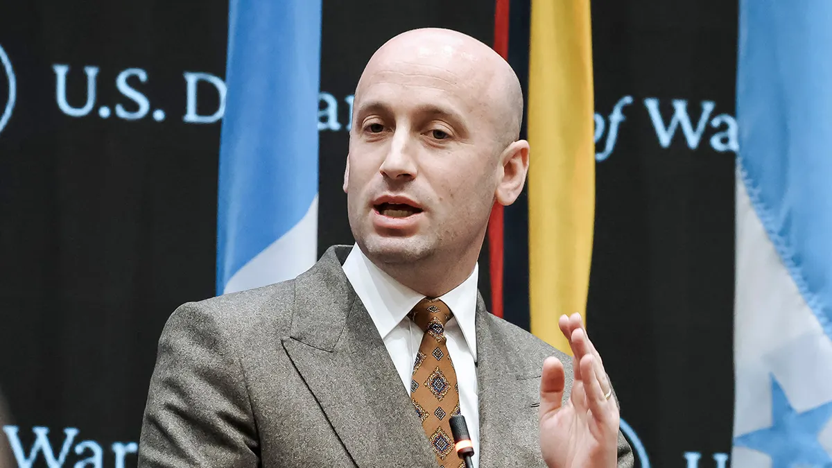 O Vice-Chefe de Gabinete de Política da Casa Branca, Stephen Miller, discursa durante a Conferência inaugural de Combate ao Cartel das Américas, na sede do Comando Sul dos EUA (SOUTHCOM), em Doral, Flórida, em 5 de março. (Eva Marie Uzcategui/AFP by way of Getty Photos)
