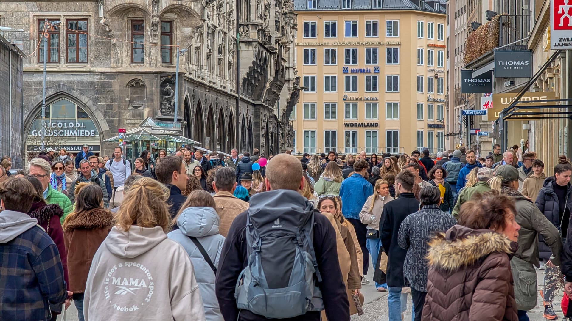 Multidões de pedestres e compradores caminham pela Weinstrasse em direção à Marienplatz em Munique, Alemanha, em 14 de março de 2026.