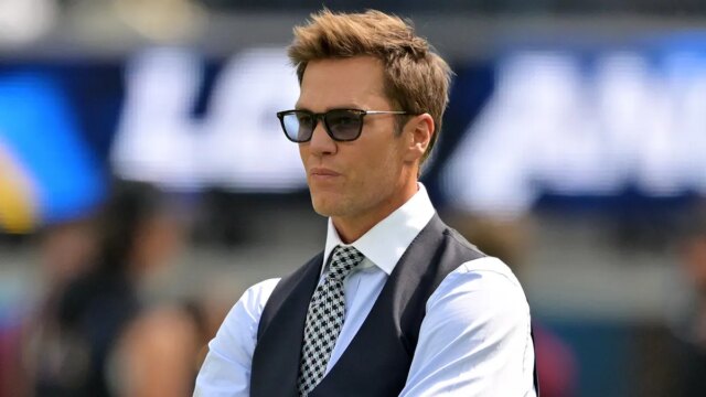 Tom Brady observa antes do jogo entre o Los Angeles Chargers e o Washington Commanders no SoFi Stadium em 5 de outubro de 2025. (Jayne Kamin-Oncea/Imagens Imagn)