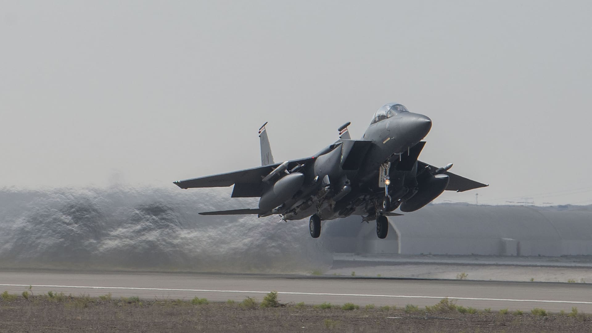 Um F-15E Strike Eagle da Força Aérea dos EUA pilotado por um membro do 494º Esquadrão de Caça Expedicionário decola da Base Aérea de Al Dhafra, nos Emirados Árabes Unidos, em apoio às operações de segurança regional, em 30 de abril de 2021.