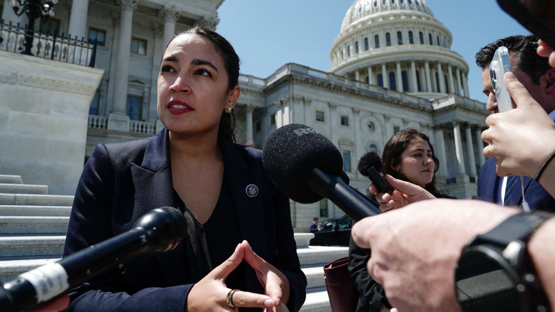 A deputada norte-americana Alexandria Ocasio-Cortez, DN.Y., fala à mídia fora do Capitólio dos EUA depois que a Câmara dos Representantes votou pela aprovação do amplo projeto de lei de gastos e impostos do presidente Donald Trump, em Washington, 3 de julho de 2025.