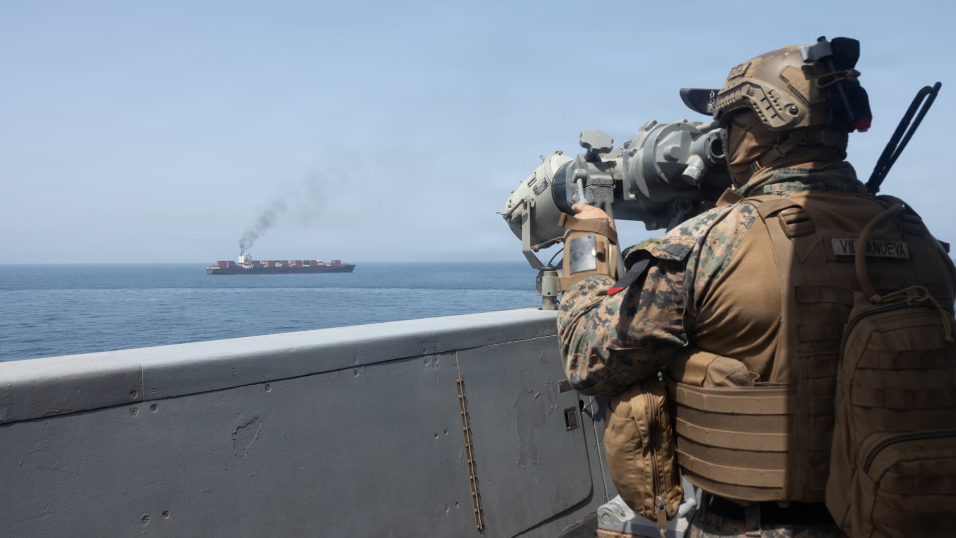 Nesta fotografia fornecida pelo Comando Central dos EUA, as forças dos EUA patrulham o Mar Arábico perto do M/V Touska em 20 de abril de 2026, depois de dispararem contra o navio de bandeira iraniana que os EUA acusaram de tentar violar o bloqueio naval dos EUA aos portos iranianos perto do Estreito de Ormuz.