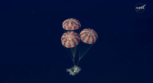 Os pára-quedas da espaçonave foram acionados na hora certa e a descida da Orion desacelerou para uma velocidade de 30 km/h quando atingiu a água no sudoeste do Pacífico de San Diego.