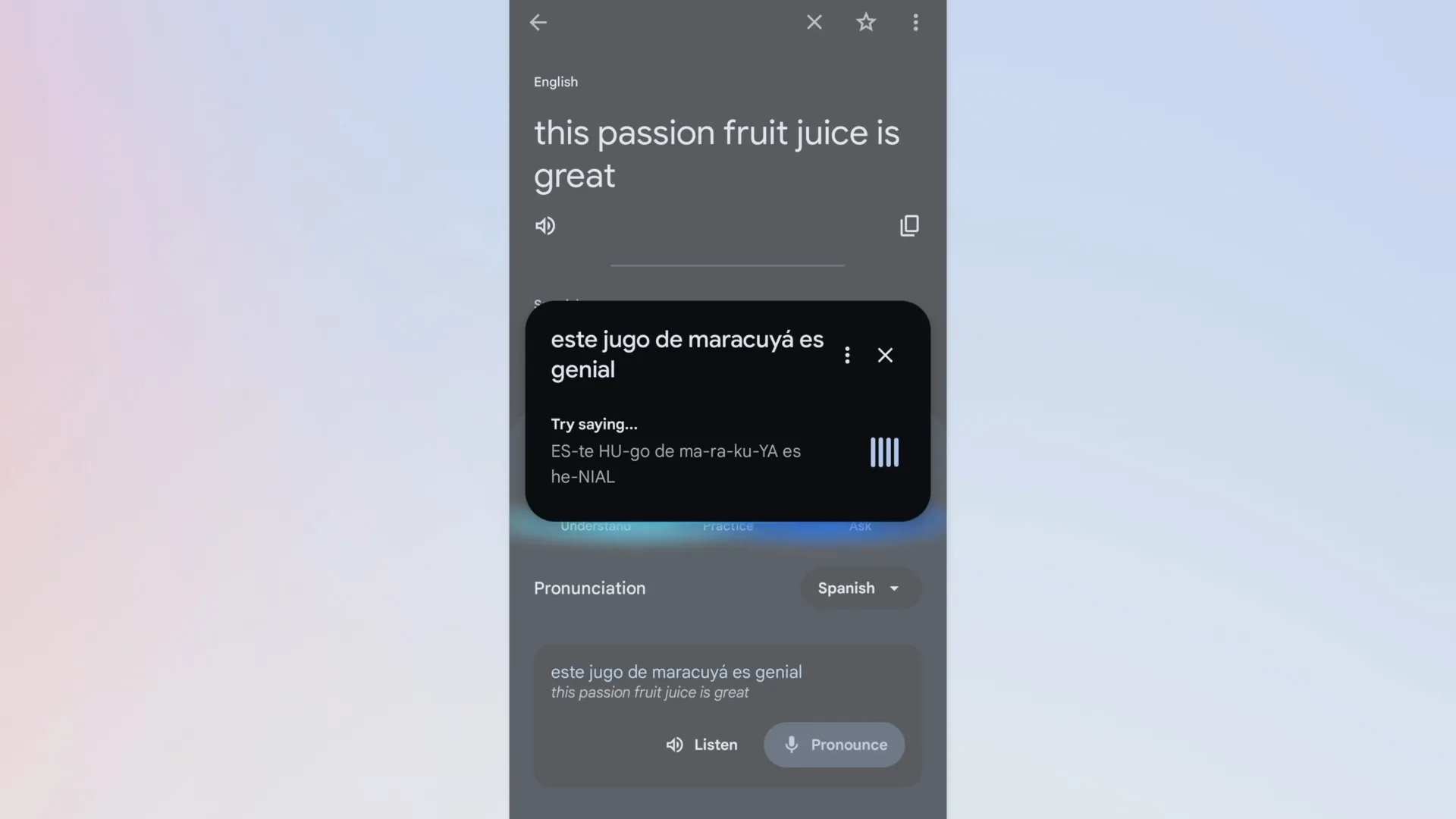 Depois de ter uma tradução, um novo botão “Praticar” aparece na parte inferior do aplicativo. Ao tocar nele, você terá duas opções. A opção “Ouvir” permite ouvir como os falantes nativos realmente dizem as palavras. A opção “Pronunciar” é onde você pode praticar.