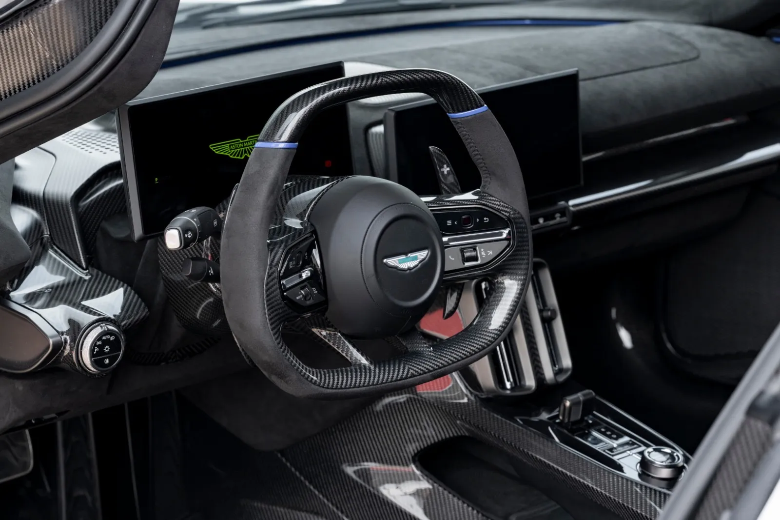 A única reclamação para o inside são as telas central e do painel, que são nítidas e responsivas, e oferecem as opções usuais de espelhamento de smartphone, mas não são luxuosas. Estamos vendo muito mais esforço atualmente com o design da tela do novo Luce da Ferrari, bem como do BMW no iX3 e i3, mas aqui, a Aston tem telas decididamente funcionais e com aparência de prateleira. Se eu estivesse me desfazendo de um milhão de dólares, talvez quisesse mais consideração aqui.