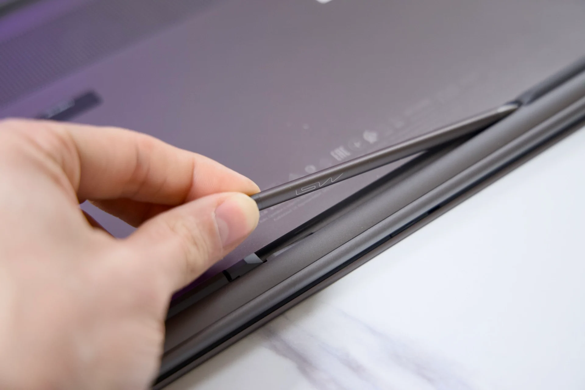 Abaixo é onde você encontrará o slot para a Nano Pen. A caneta não foi necessariamente construída para artistas que procuram uma combinação de PC e pill. Ele existe para permitir anotações rápidas em documentos e a oportunidade de destacar texto ao se preparar para um exame. Os problemas ficam claros assim que você tenta acoplar a Nano Pen ao laptop computer. Os ímãs embutidos no laptop computer e na caneta arrastam imediatamente a caneta para a lateral do chassi do laptop computer. Ao tentar combinar os pontos de carregamento da Nano Pen com seu gabinete, a caneta gira para o lado errado. A única maneira de garantir que os slots da Nano Pen estejam bem apertados é manobrá-la da maneira correta e prendê-la com as duas mãos para que ela trave no lugar.