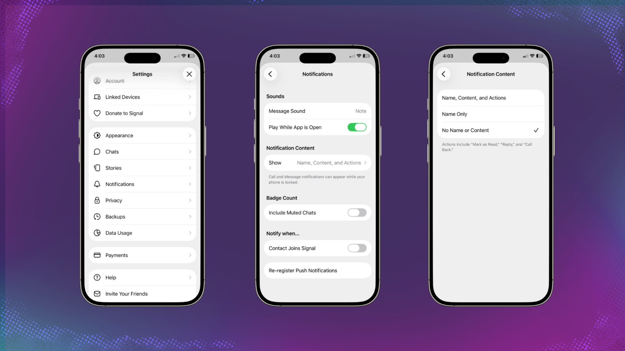 O Sign possui uma configuração interna que pode ser acessada no menu Configurações do aplicativo (toque na sua foto de perfil no canto superior esquerdo). Toque na seção “Notificação” e depois em “Conteúdo da notificação”. Em seguida, escolha “Sem nome ou conteúdo” para que as notificações push não mostrem nenhuma informação específica sobre as mensagens que você recebeu.