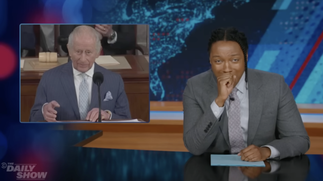 No clipe acima, Programa Diário o apresentador Josh Johnson reproduz imagens do rei fazendo o Congresso rir com uma piada sobre a “história compartilhada” entre os EUA e o Reino Unido.