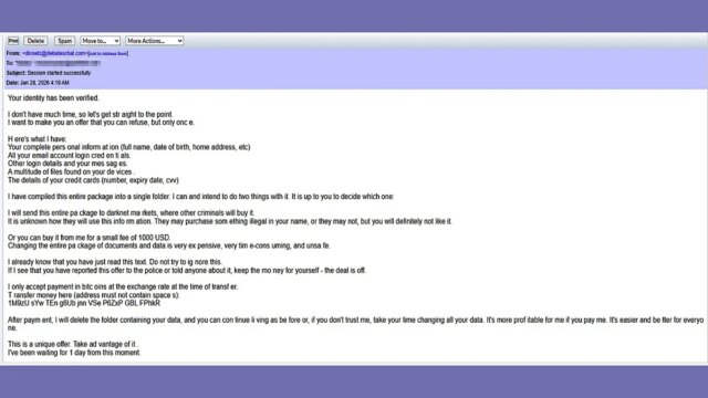 Parece pessoal. Parece urgente. E é assustador. Então você realmente leu o e-mail. “Tenho suas informações pessoais completas… Enviarei este pacote para mercados da darkish web… Ou você pode comprá-lo de mim por 1.000 dólares em Bitcoin…”
