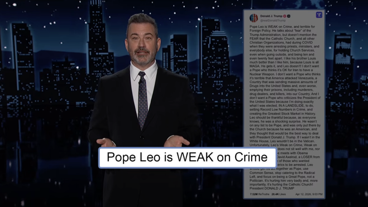 Este é o resumo de Jimmy Kimmel da última explosão de Donald Trump no Reality Social, que o viu atacar o Papa Leão XIV no fim de semana e ligando para ele “FRACO no Crime”, seguindo os recentes apelos do Papa à paz.