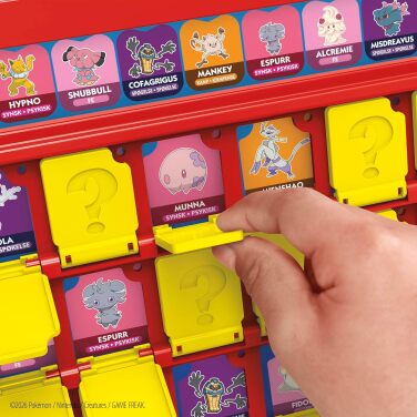 A versão Pokémon de Adivinha quem? joga como a versão padrão, mas em vez de perguntar: “Sua pessoa é careca?” você poderá fazer perguntas divertidas como: “Seu Pokémon é do tipo água?” O primeiro jogador a adivinhar cinco Pokémon misteriosos é coroado campeão.