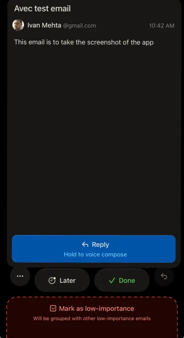 Ao gerenciar sua caixa de entrada, o Aved permite marcar e-mails sem importância deslizando para baixo um e-mail específico. O e-mail aprenderá com o que foi colocado na pilha sem importância e poderá mostrá-lo a você em um grupo, em vez de forçá-lo a fazer a triagem desses e-mails um por um.
